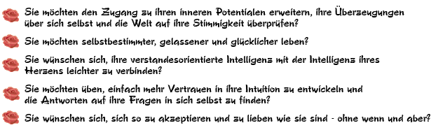 Mit Hilfe von kraftvollen, positiven Bildern und Gefühlen können Sie neue Überzeugungen und Glaubensätze verankern. So sind Sie ein bewusster Schöpfer Ihrer Gedanken, Erfahrungen und Verhaltensweisen.